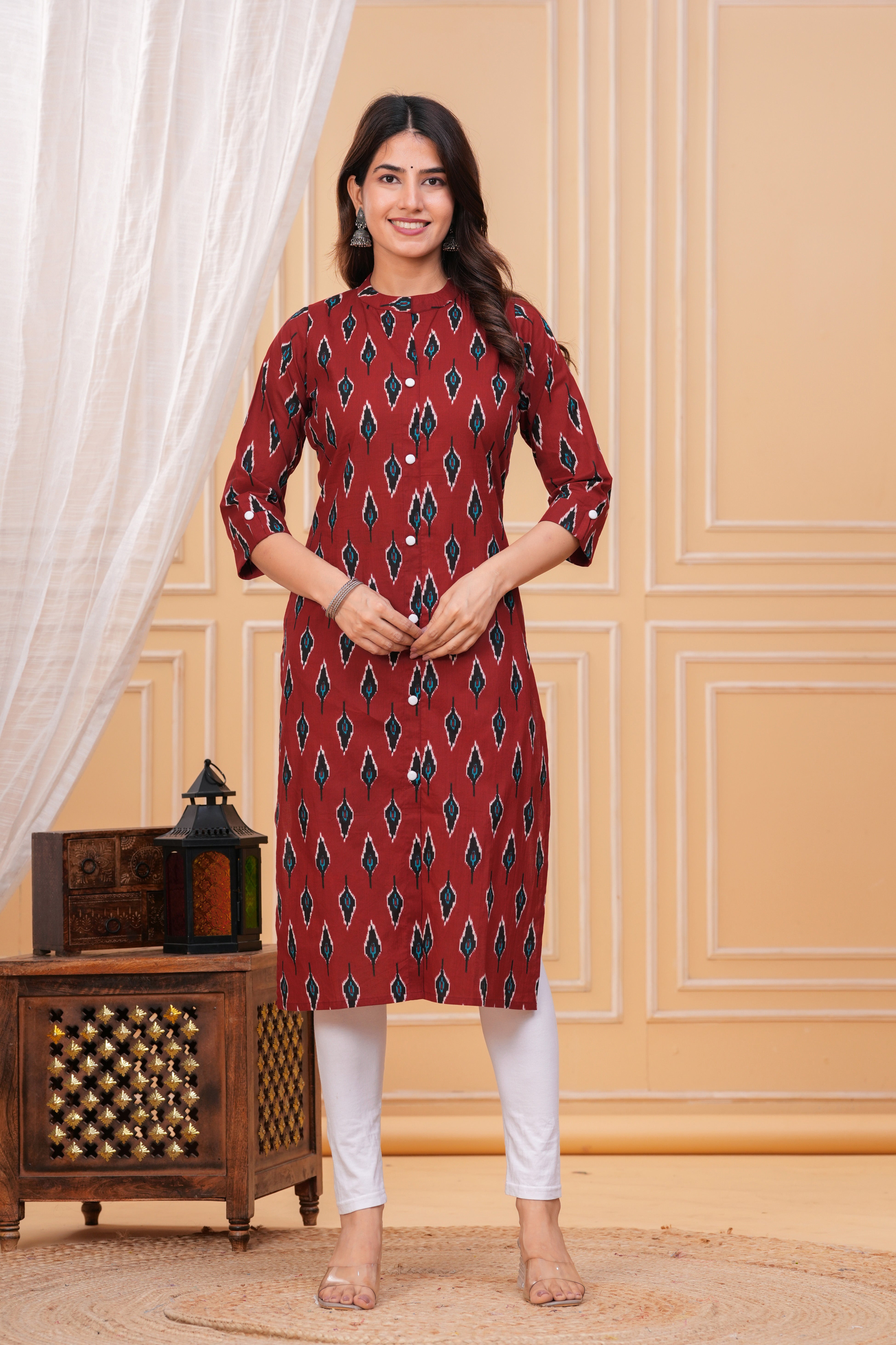 This elegant red Ikkat cotton long kurta for women. Crafted from breathable and skin-friendly pure cotton fabric, this kurta features a traditional Ikkat weave pattern that reflects timeless Indian artistry. The vibrant red base is beautifully balanced with subtle geometric motifs, making it ideal for both casual outings and festive occasions.