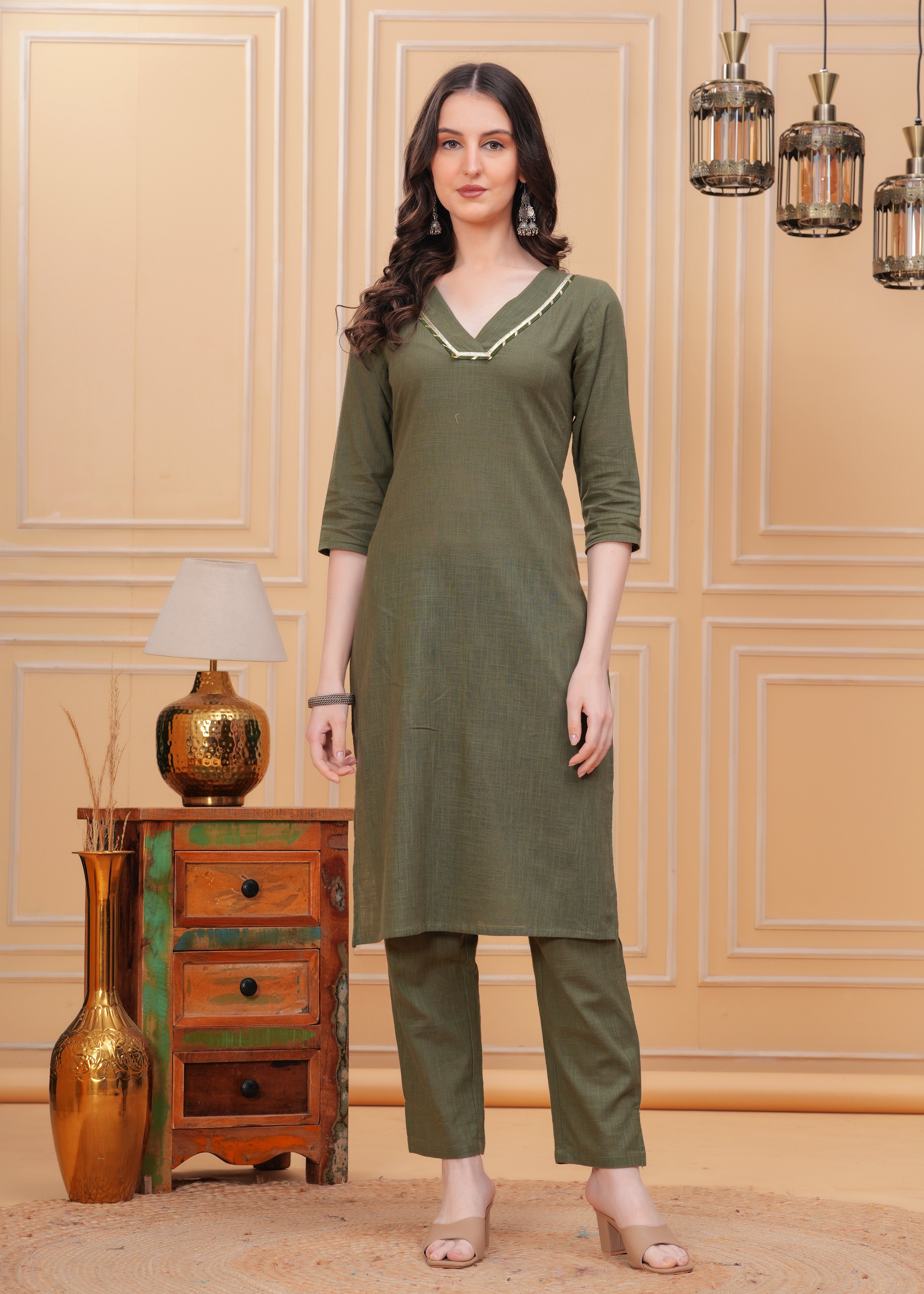 Experience timeless elegance with our Olive Green Kurta Pant Set. Made from high-quality cotton, this set combines style and comfort in one. Whether you're attending a special occasion or simply want to elevate your everyday look, our kurta pant set is the perfect choice. Elevate your wardrobe with this stylish and comfortable addition.