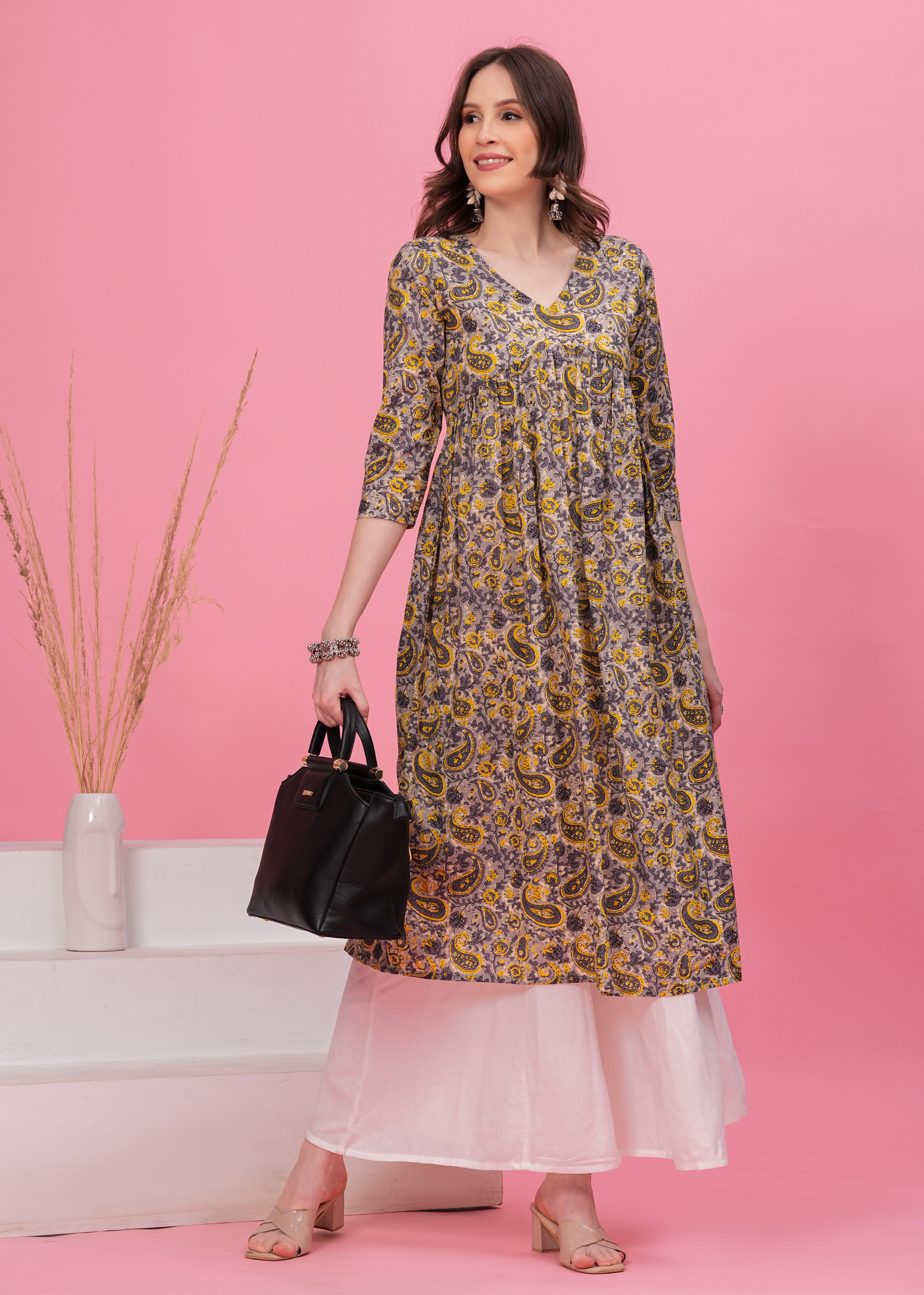 Expertly crafted v neck flared kurta, featuring a beautiful paisley print. This stylish and comfortable piece is perfect for any occasion, offering a flattering fit and versatile style. Made with high-quality materials, it will be a valuable addition to your wardrobe.