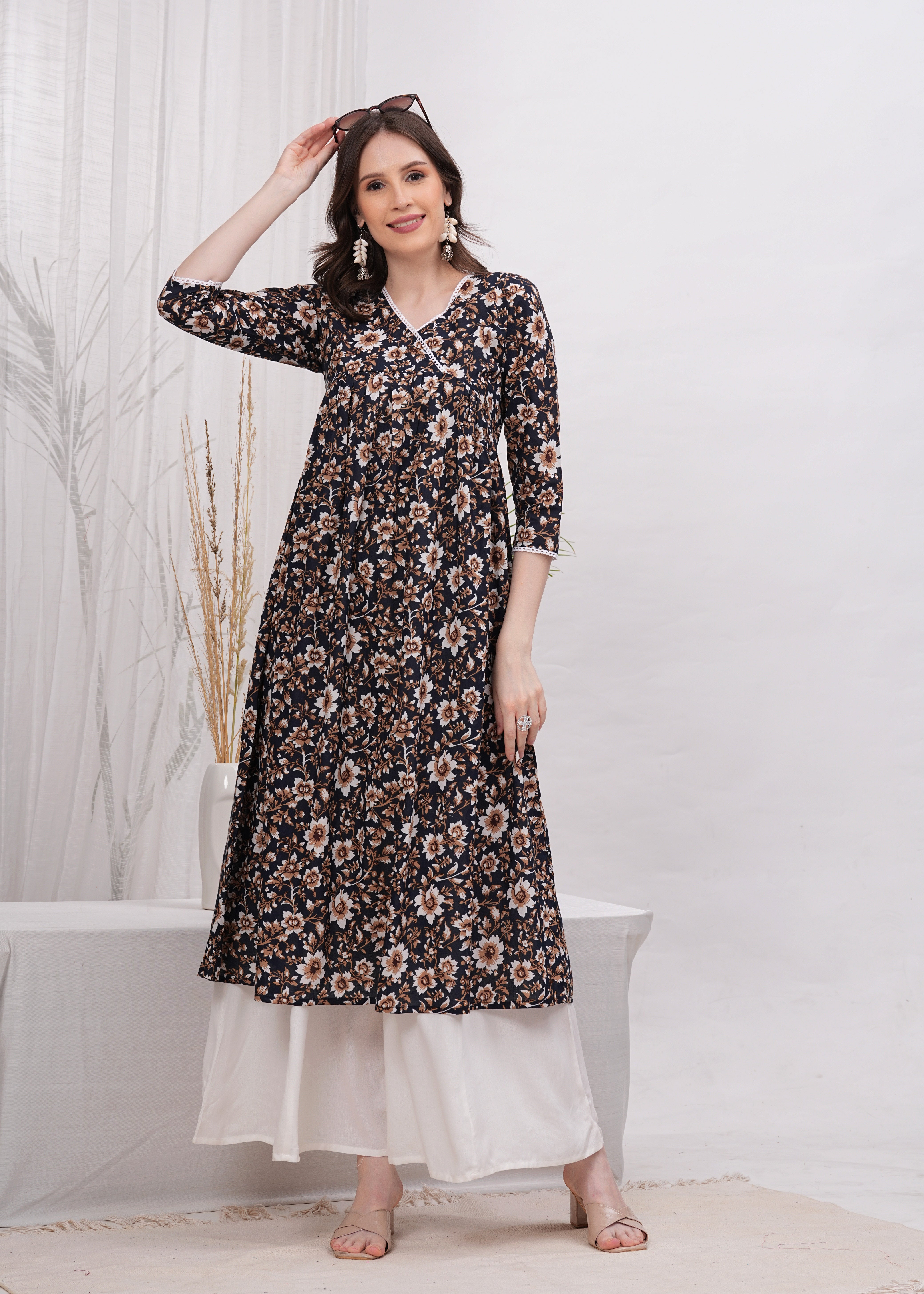 Upgrade your wardrobe with our stylish Kurta Set! Made with a unique printed design and flared fit, this kurta exudes elegance and comfort. Its 3/4 sleeve and bottom detailing add the perfect touch of sophistication. Elevate your fashion game with this versatile and trendy piece.