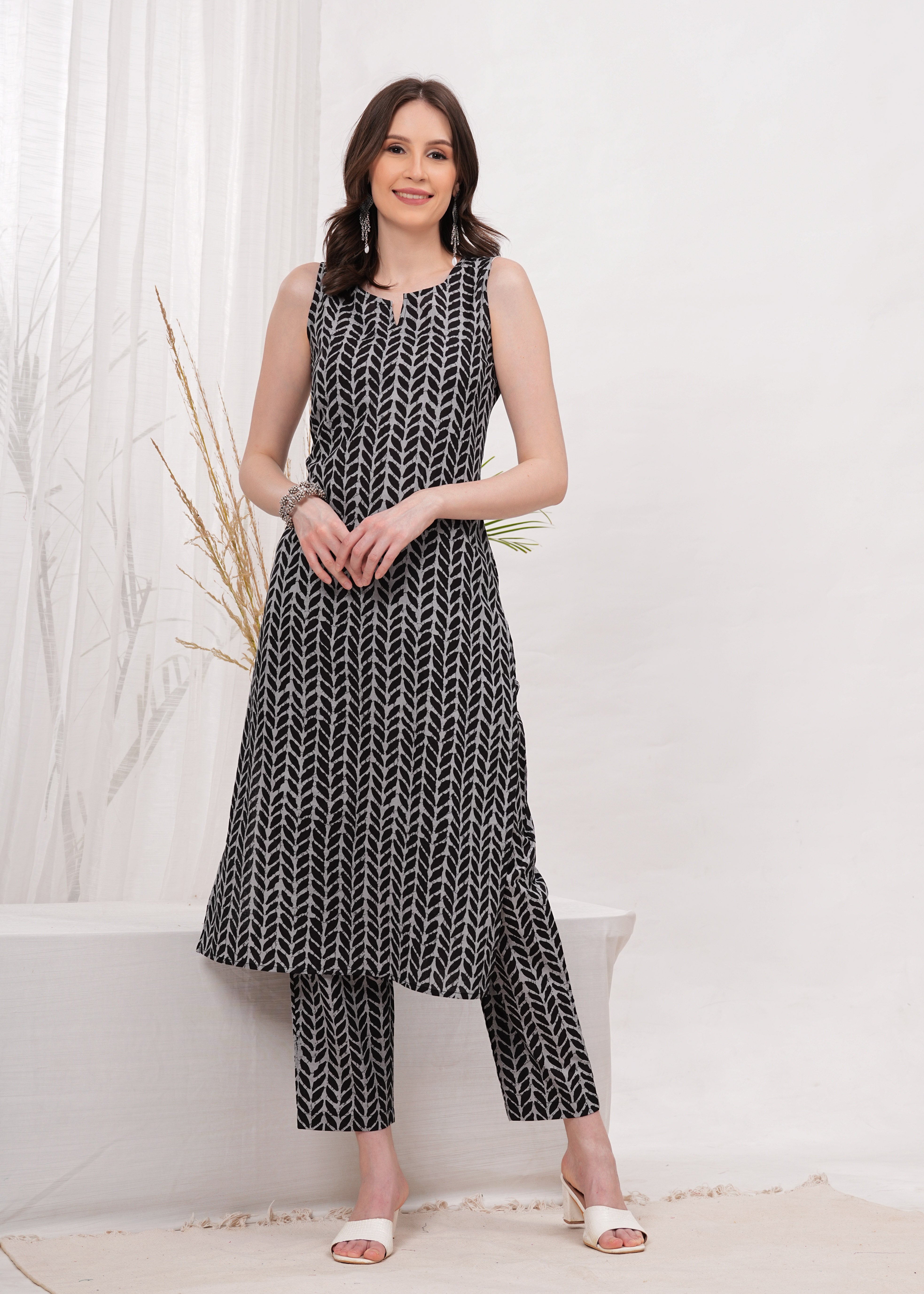 A traditional and elegant kurta set, featuring a straight kurta with a beautiful print that is also present on the bottom. With its sleeveless design, this set is perfect for warmer days and adds a touch of sophistication to any outfit. Complete your traditional look with this must-have kurta set.