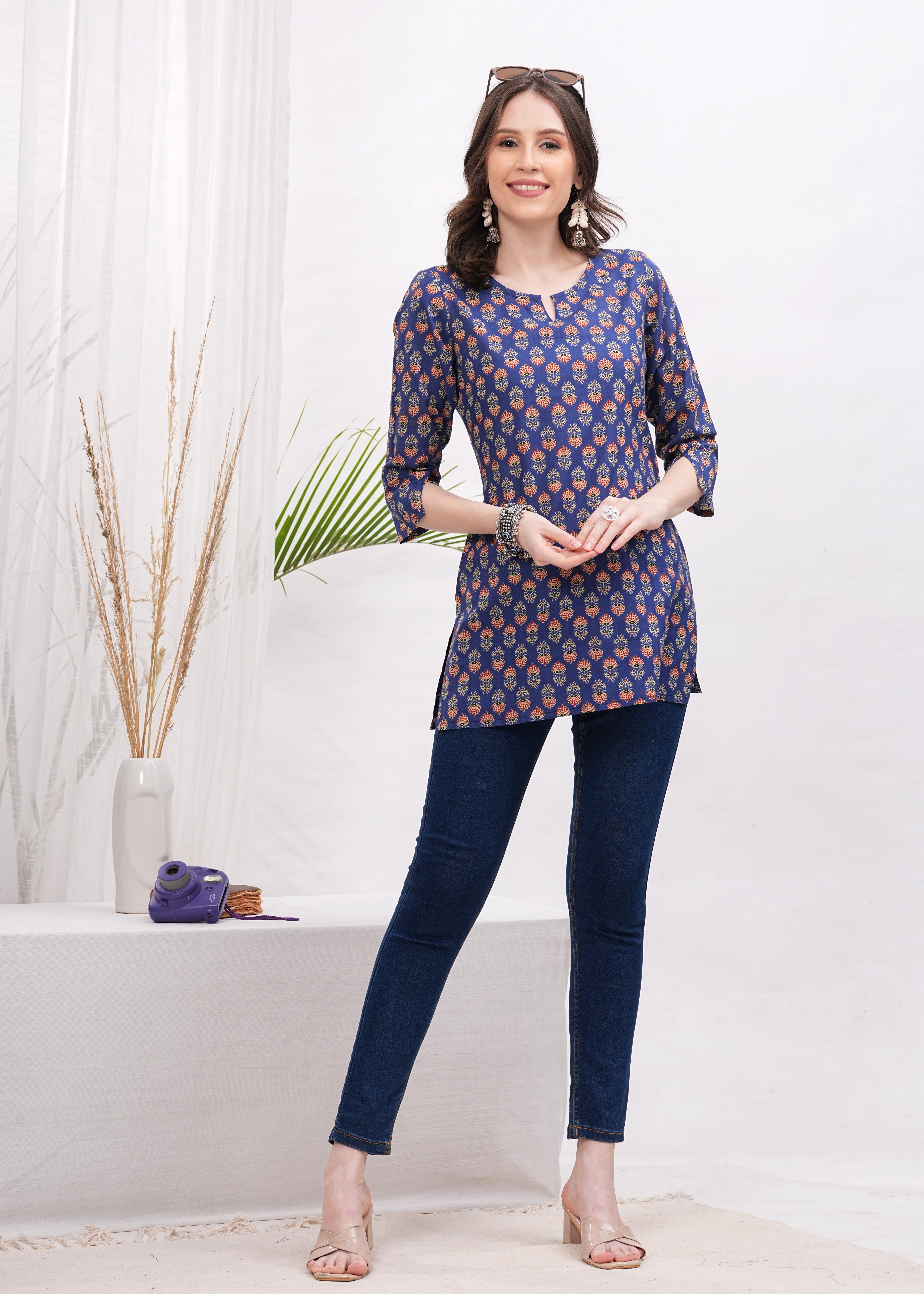 This versatile Kurti is the perfect addition to your wardrobe. With its short length, it can be easily dressed up or down for casual wear or office wear. Made with high-quality materials, it offers both comfort and style. A must-have for any fashion-forward individual.