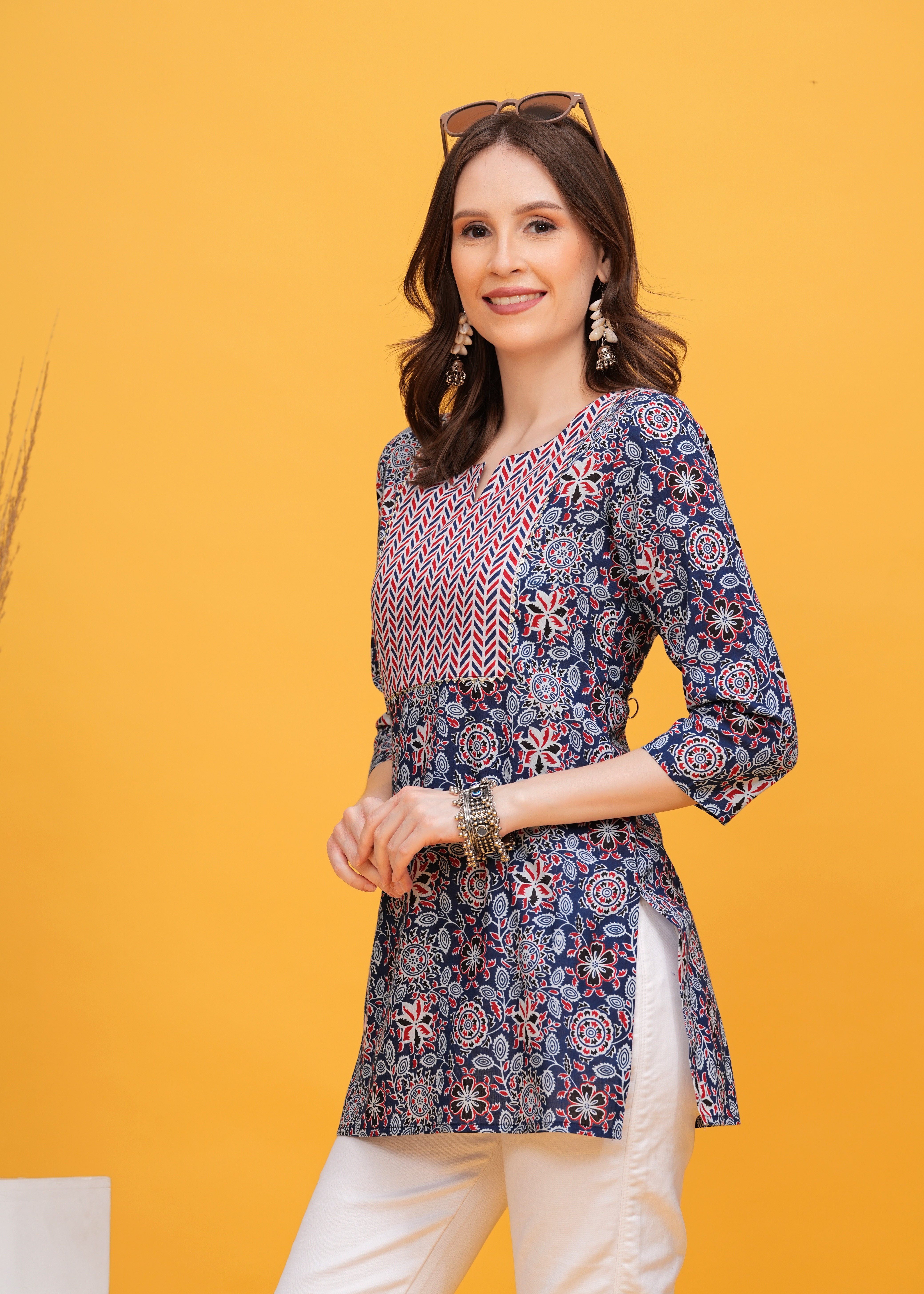This stylish cotton kurti features a beautiful yoke design and eye-catching colorful patterns. Made from high-quality cotton, it offers comfort, durability, and a touch of elegance to any outfit. Perfect for any occasion, this kurti is a must-have for any fashion-forward wardrobe.
