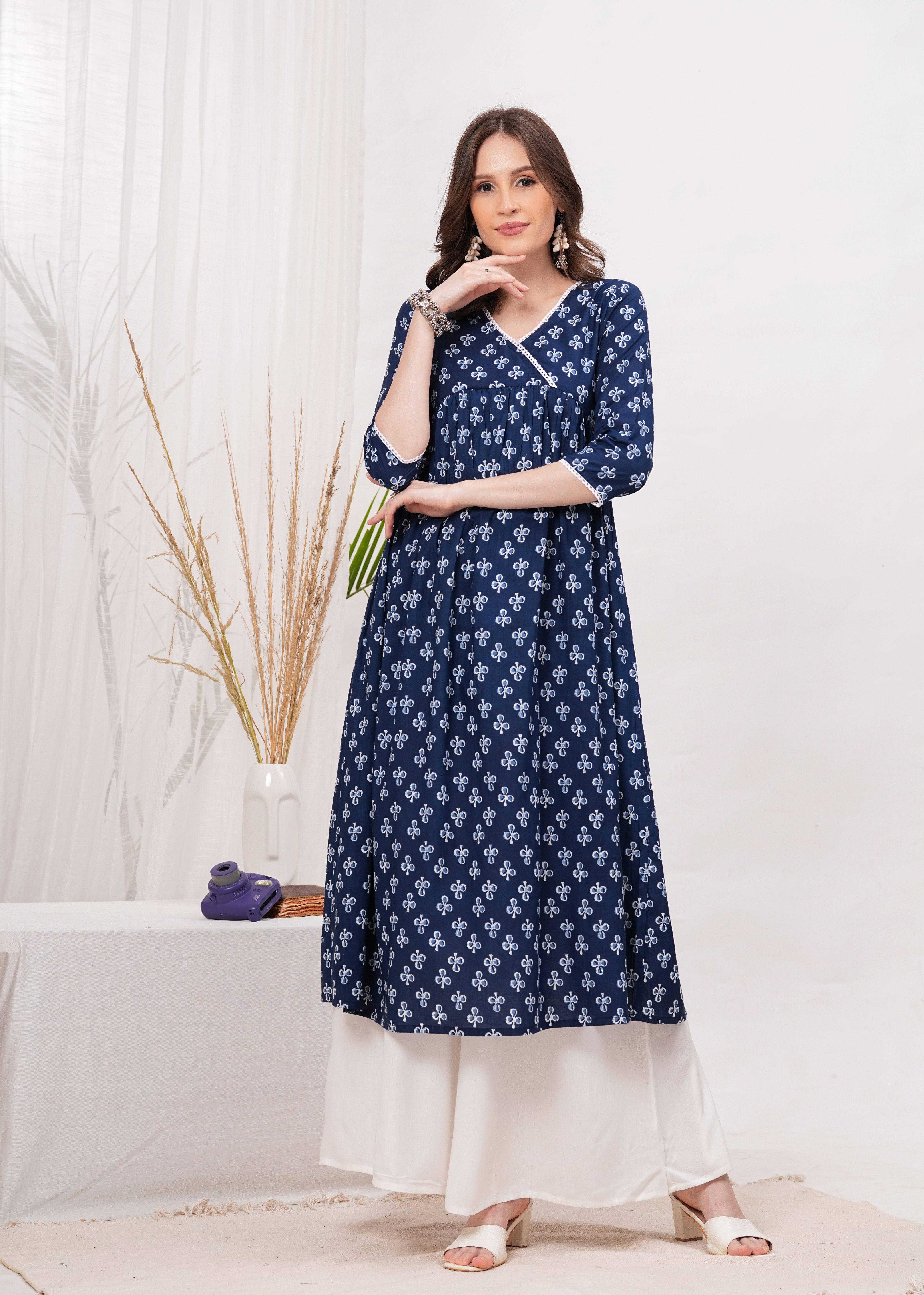 This Kurti is a stylish blend of a V neck flared kuta design, printed cotton fabric, and delicate lace accents. The soft, breathable material and intricate details make it perfect for any occasion. Stay comfortable and fashionable with our Kurti.