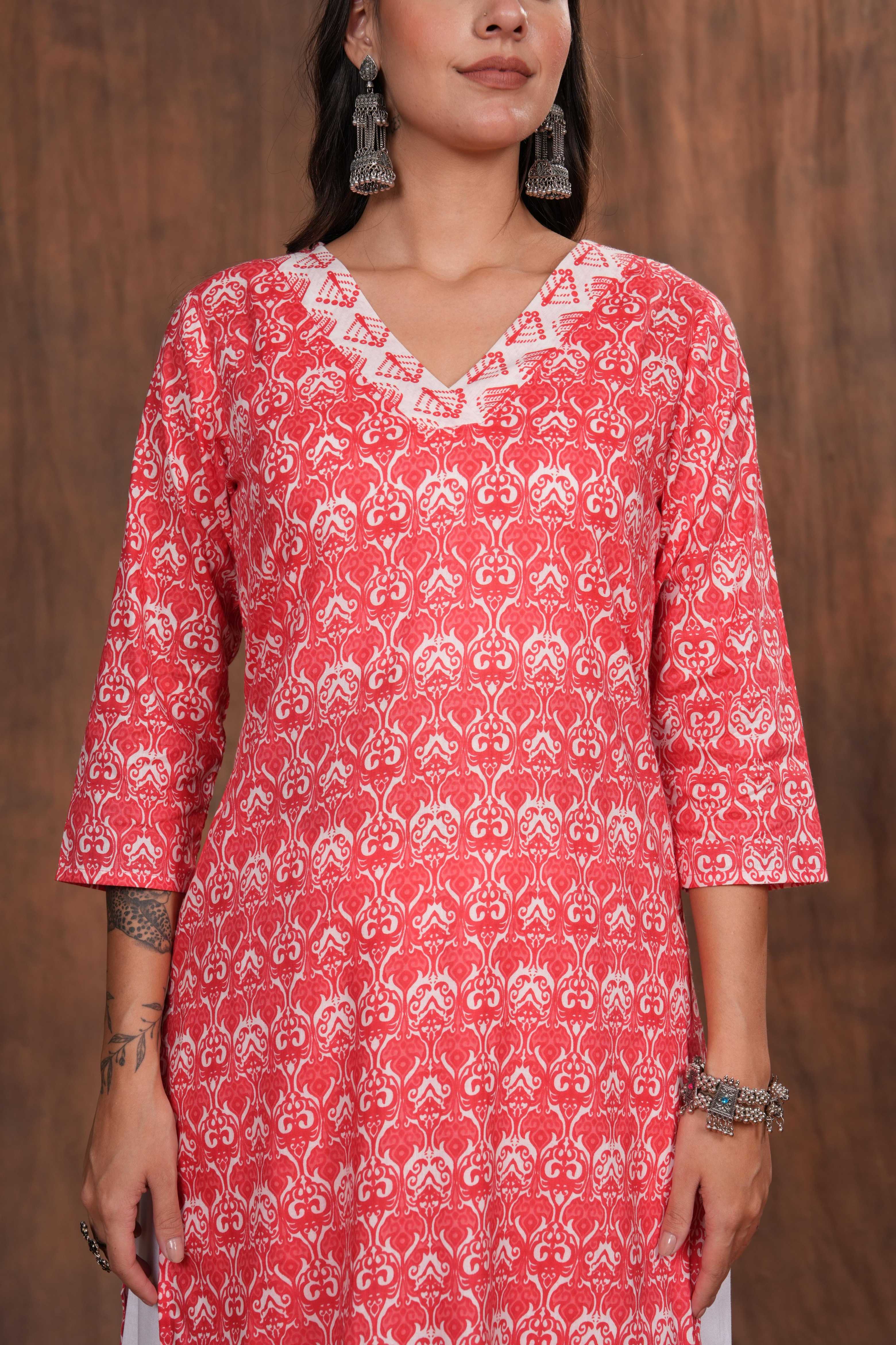 Indulge in unique style with our Long Kurti. Made of soft and breathable cotton, this Red Printed kurti features a one-of-a-kind neck design that sets it apart from the rest. Enjoy comfort and fashion in one with this statement piece.