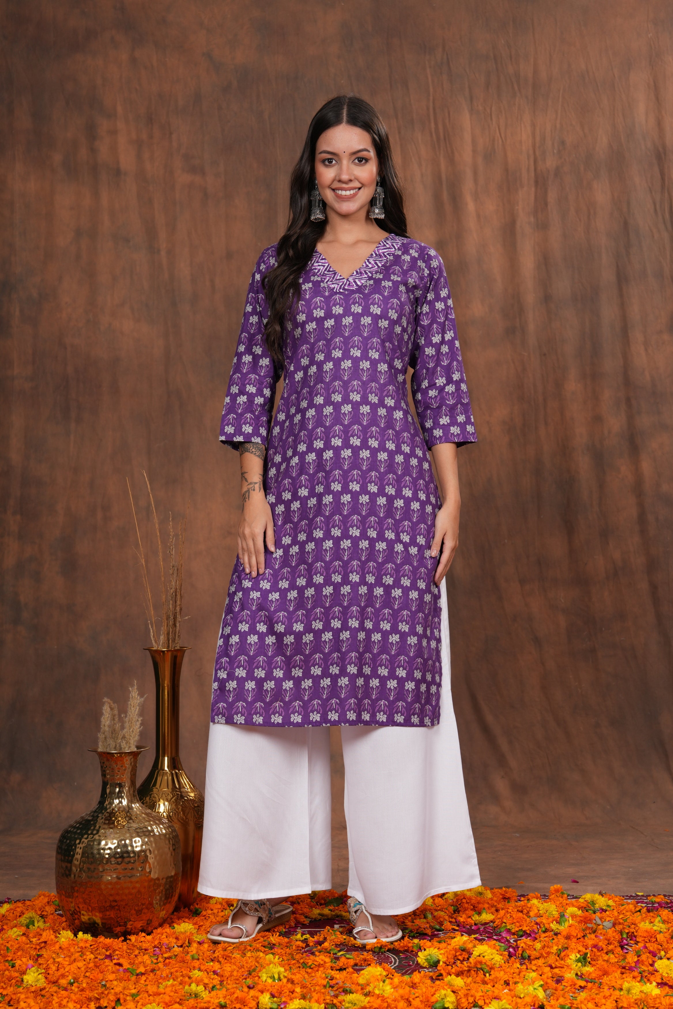 This purple printed long kurti features a unique neck lining and is made of comfortable cotton fabric. Perfect for any occasion, it combines style with comfort for a chic look. Made with high quality materials, it is both durable and stylish.