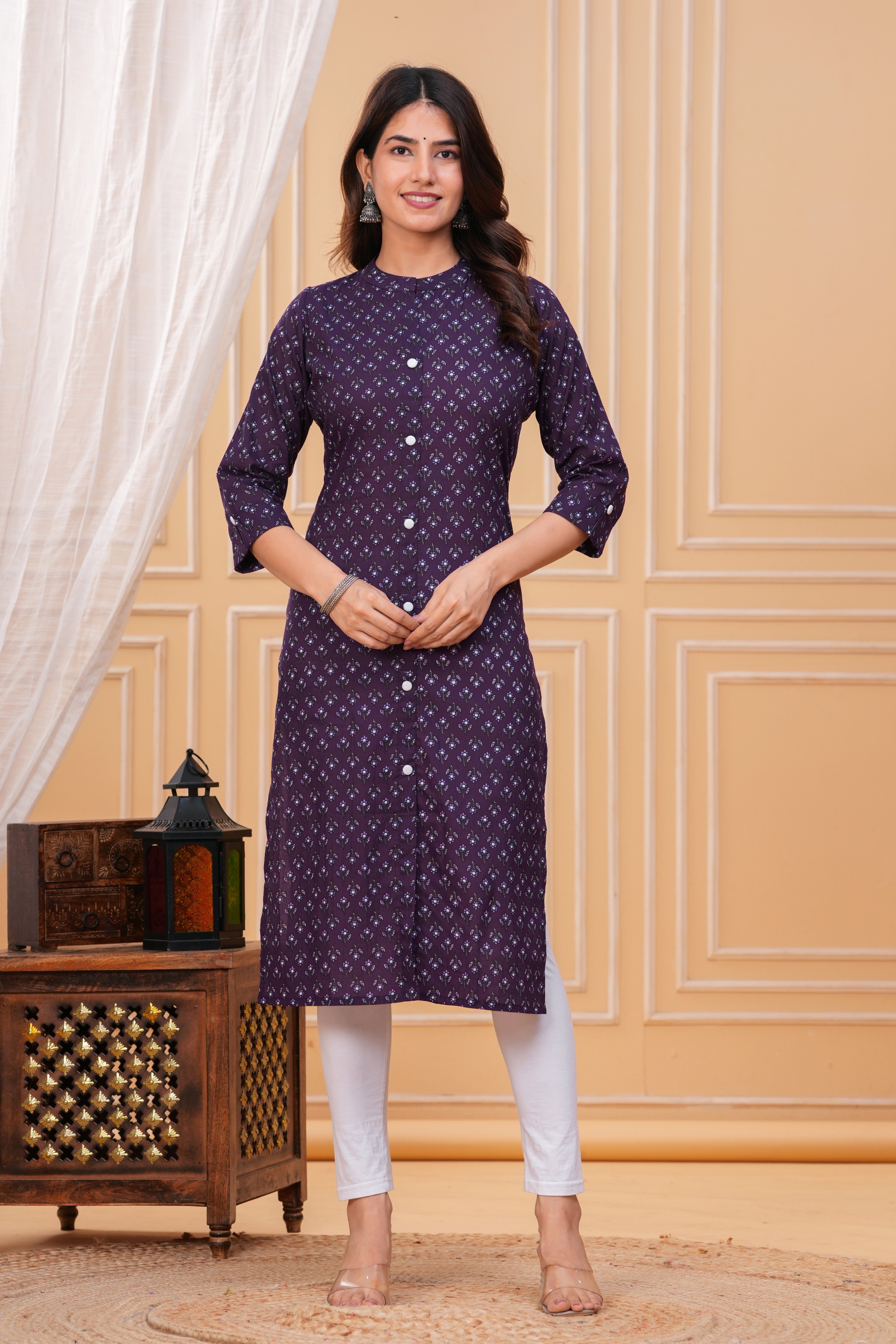 Add a pop of regal charm to your ethnic wardrobe with this Purple Cotton Long Kurta for women. Tailored from breathable and lightweight pure cotton, this kurta is perfect for all-day comfort, whether you're heading to work, running errands, or enjoying a casual day out.