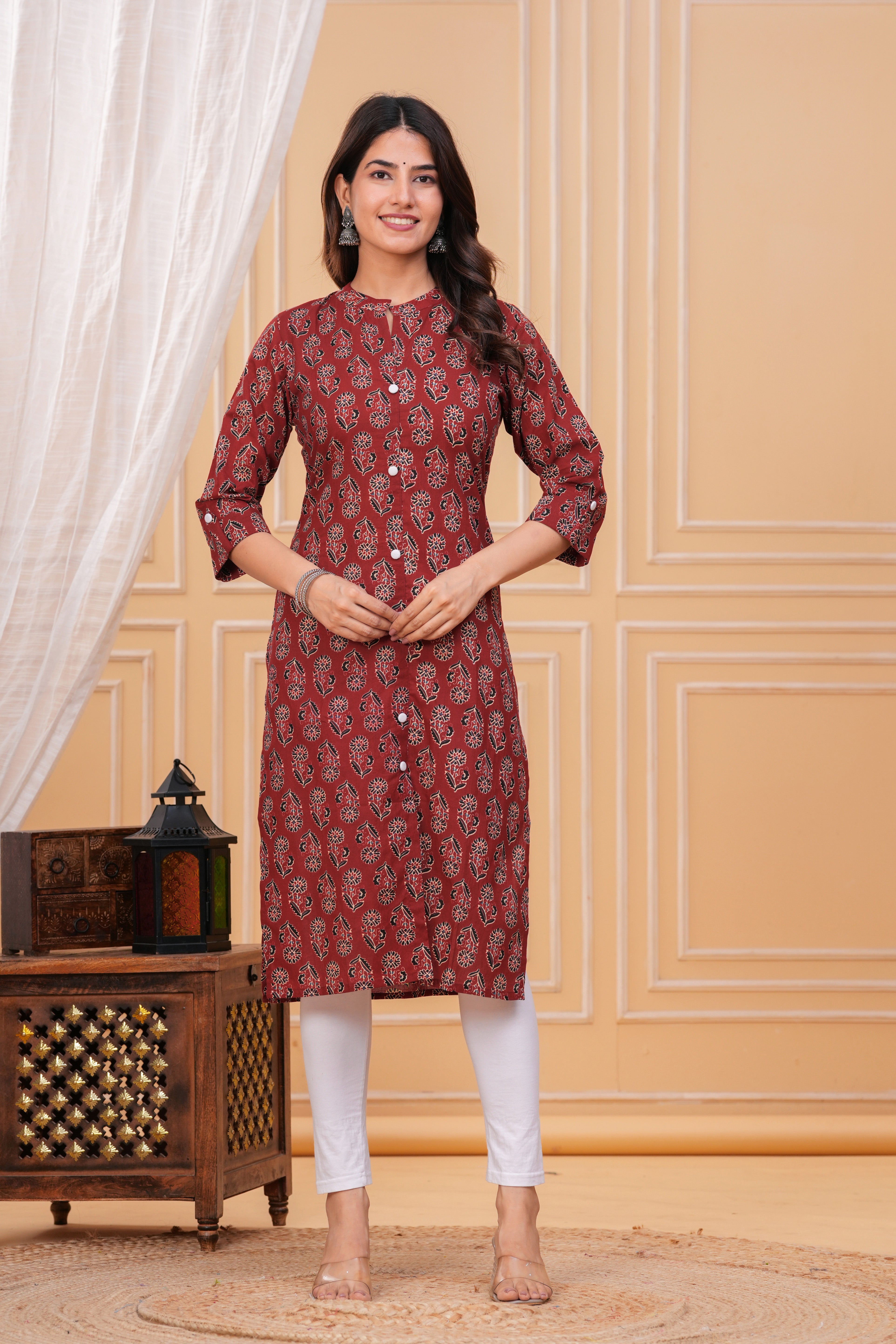 Step into timeless elegance with this Red Ajrak Print Cotton Long Kurta for women. Made from soft and breathable pure cotton fabric, this kurta features the iconic Ajrak block print – a centuries-old art form known for its intricate patterns and rich natural dyes. The deep red base combined with traditional geometric and floral motifs lends a striking and earthy appeal.