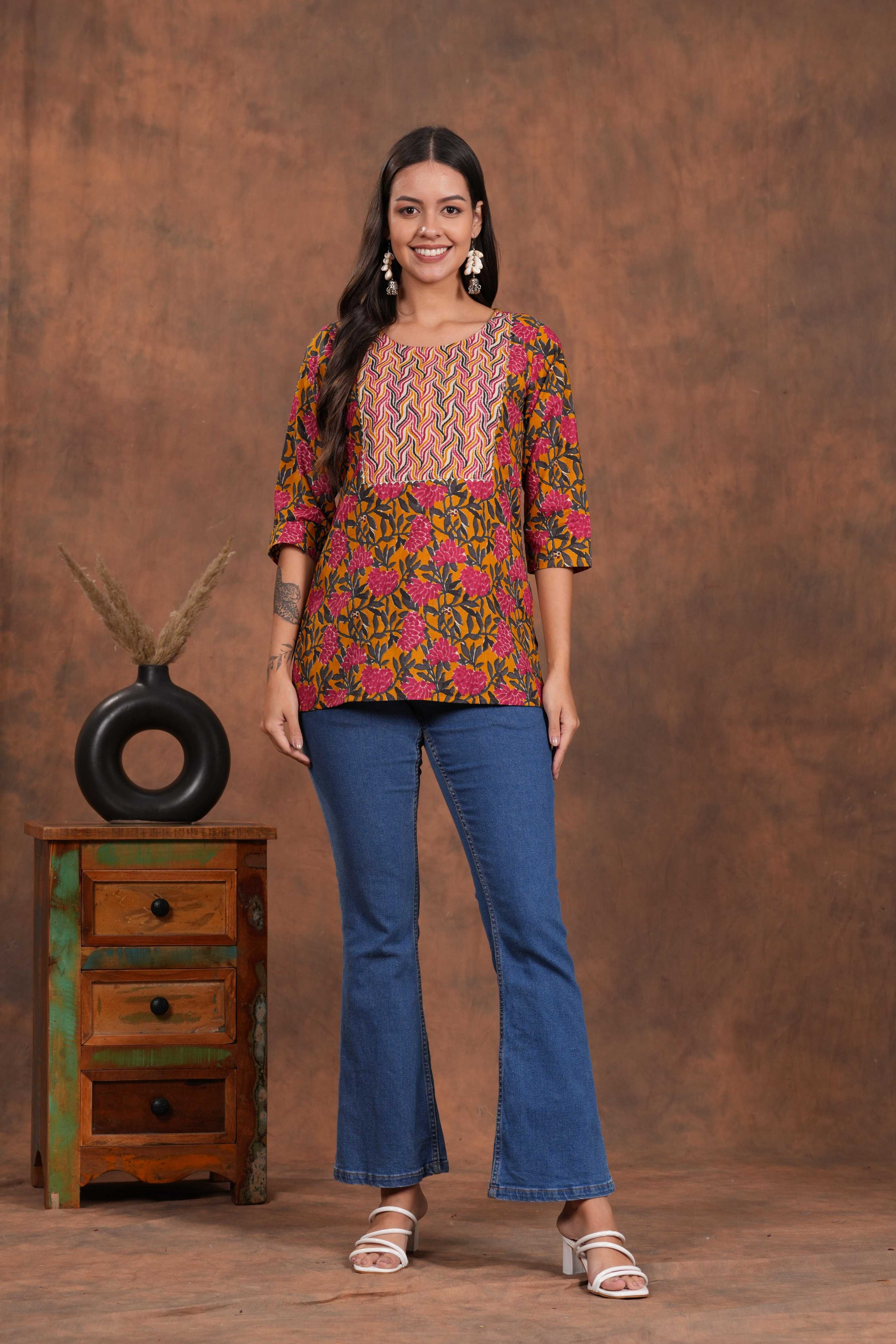 This pure cotton Short Kurti features a stylish yoke and vibrant floral print. With its lightweight fabric, it offers comfort and breathability, making it perfect for everyday wear. Elevate your wardrobe with this versatile and fashionable piece.