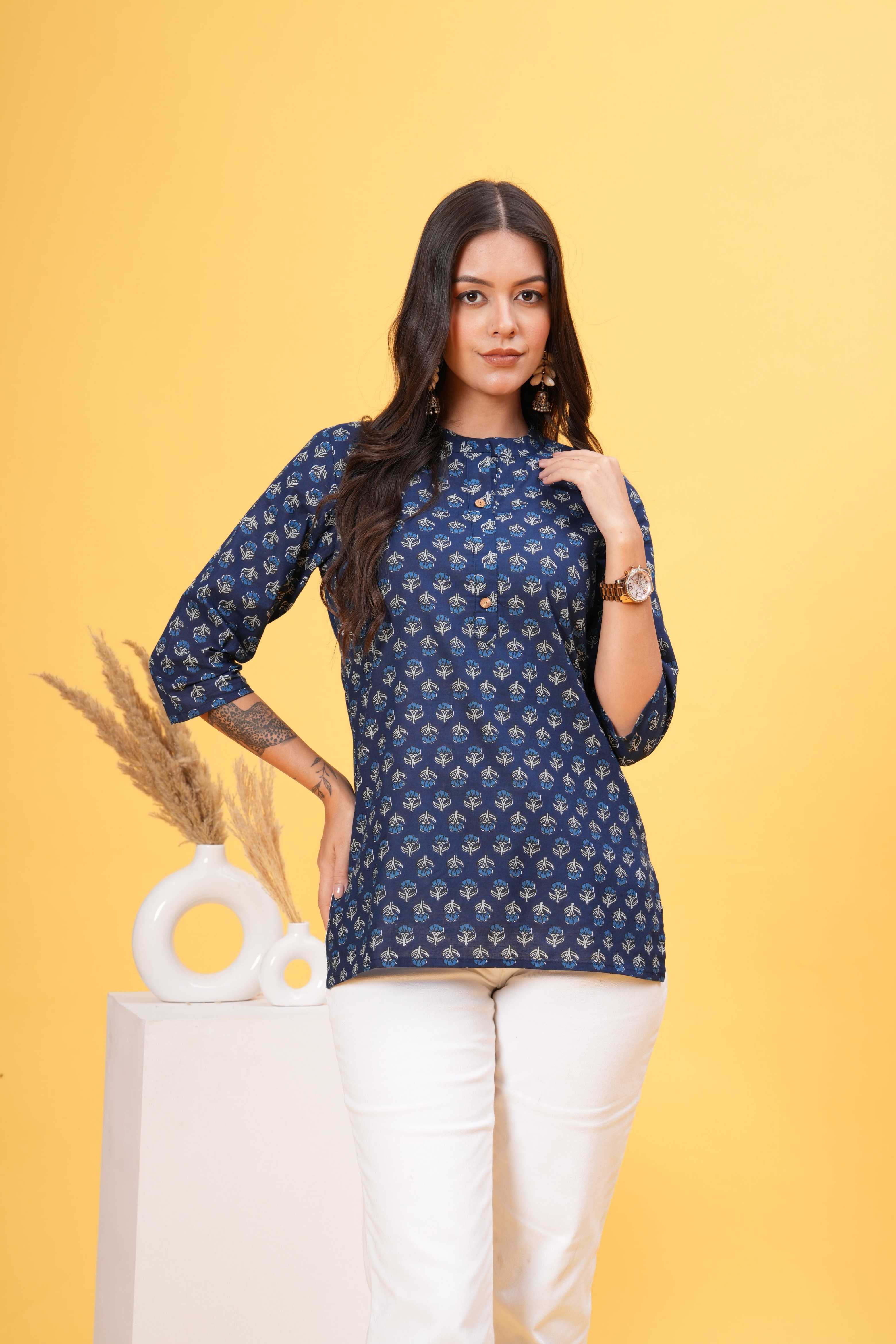 The Short Kurti features a Chinese collar with buttons and a blue printed design, making it a stylish and comfortable choice for any occasion. Made from high-quality cotton material, this Kurti is perfect for everyday wear and is sure to keep you looking and feeling your best.
