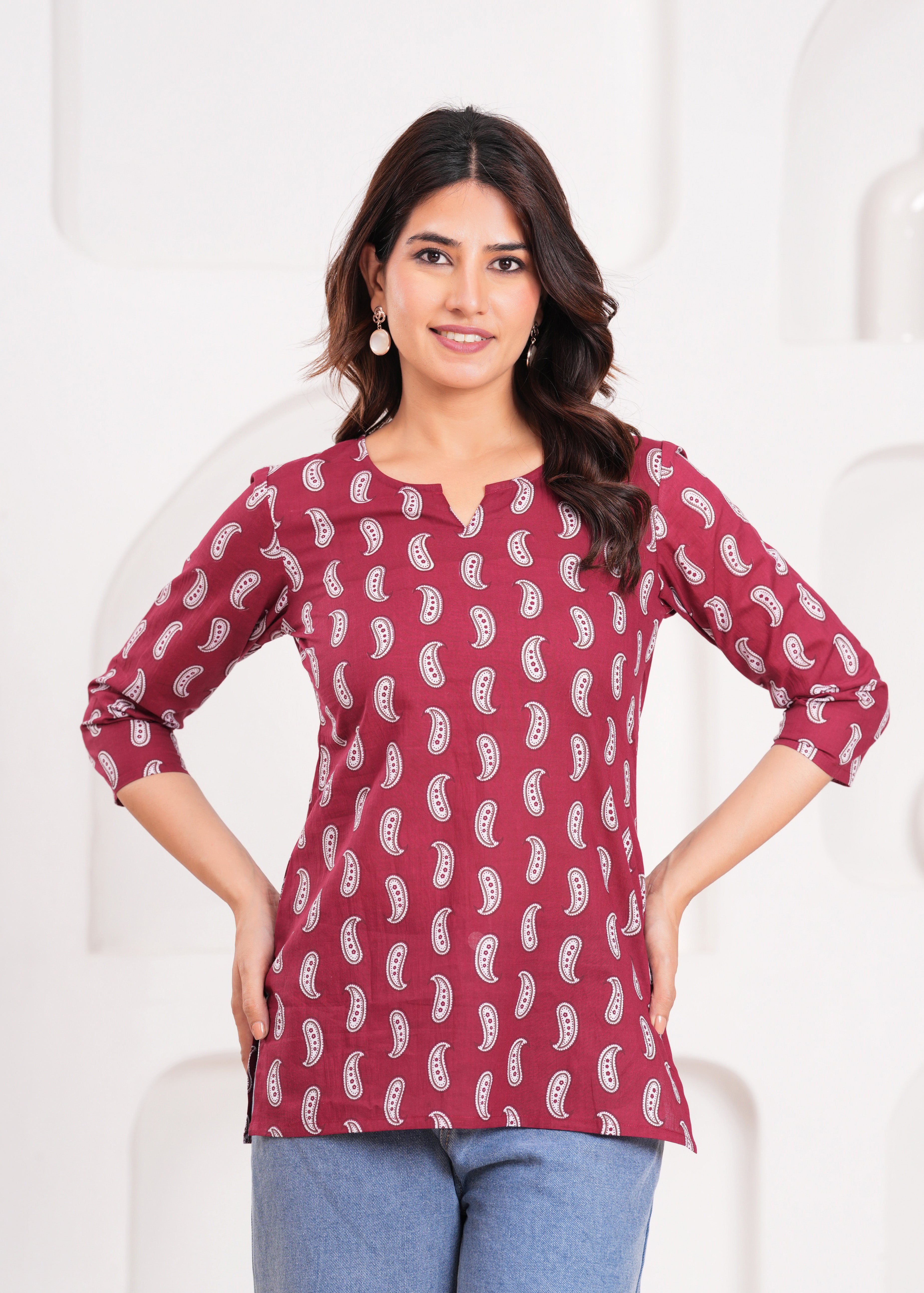 Made from soft, breathable pure cotton, this kurti ensures all-day comfort, keeping you cool and relaxed even during warmer days. Its lightweight fabric and easy fit make it ideal for casual outings, office wear, college days, or semi-formal gatherings. Whether styled with minimal accessories for a subtle look or paired with statement jewelry for a festive touch, this red-maroon kurti is a timeless addition to your collection