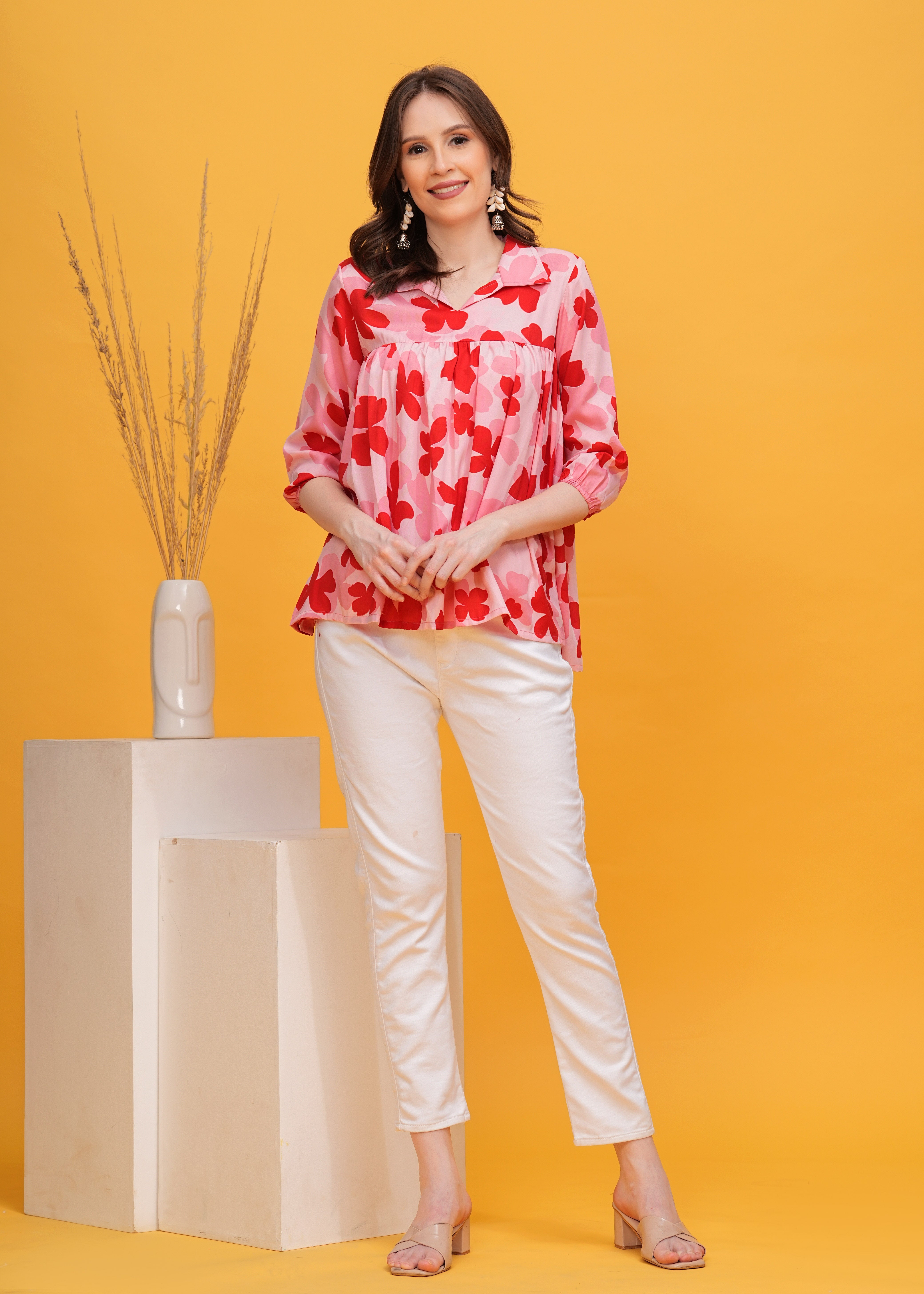 Introducing our stylish top, featuring a shirt collar and a beautiful flower print. With 3/4 sleeves, this top is perfect for any occasion. Stay on trend and elevate your wardrobe with this versatile and flattering piece.