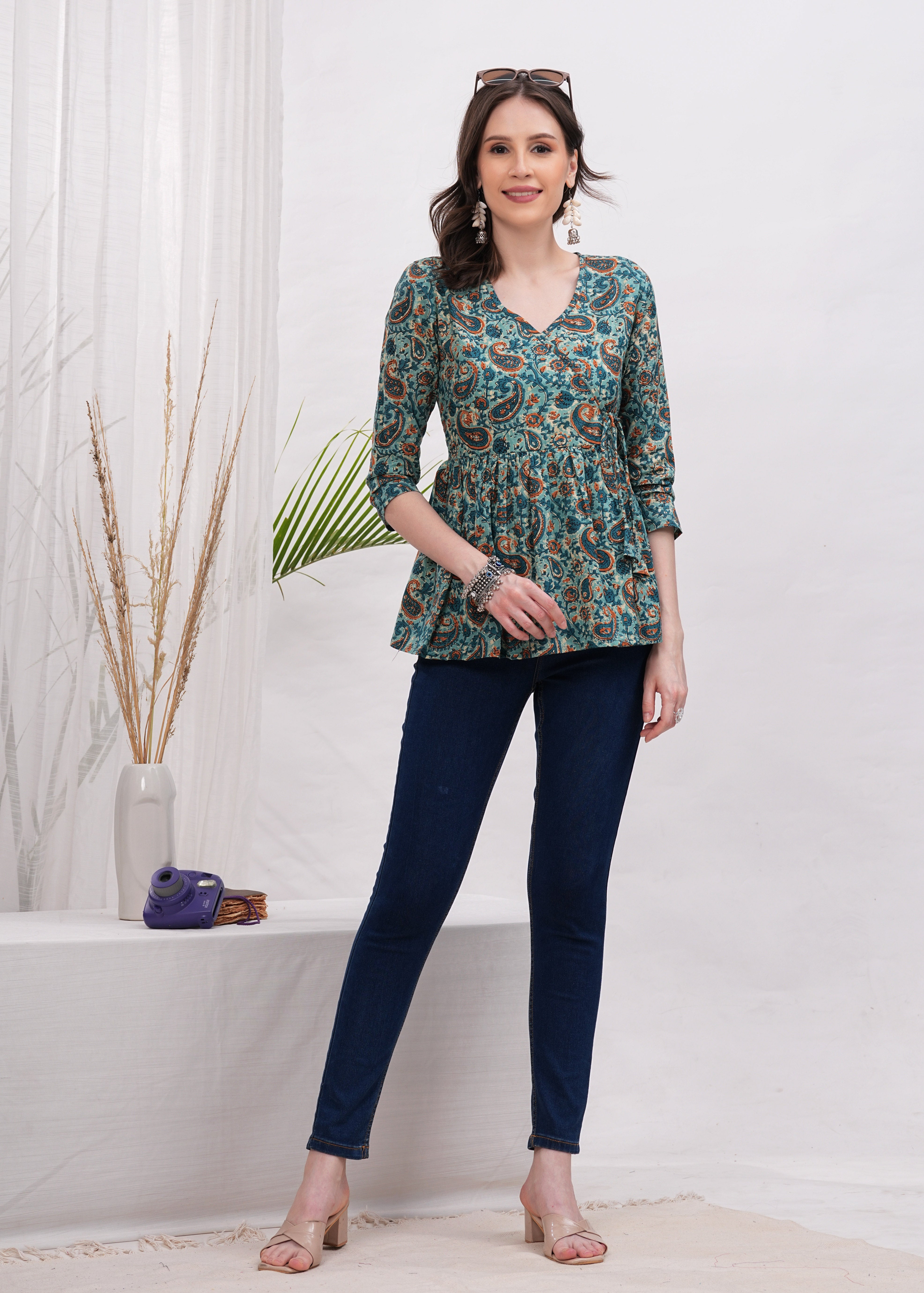 This top features an Angrakha design and 3/4 sleeve length, making it both stylish and comfortable. Made of cotton, it offers a breathable and versatile option for any wardrobe. Elevate your fashion game with this top.